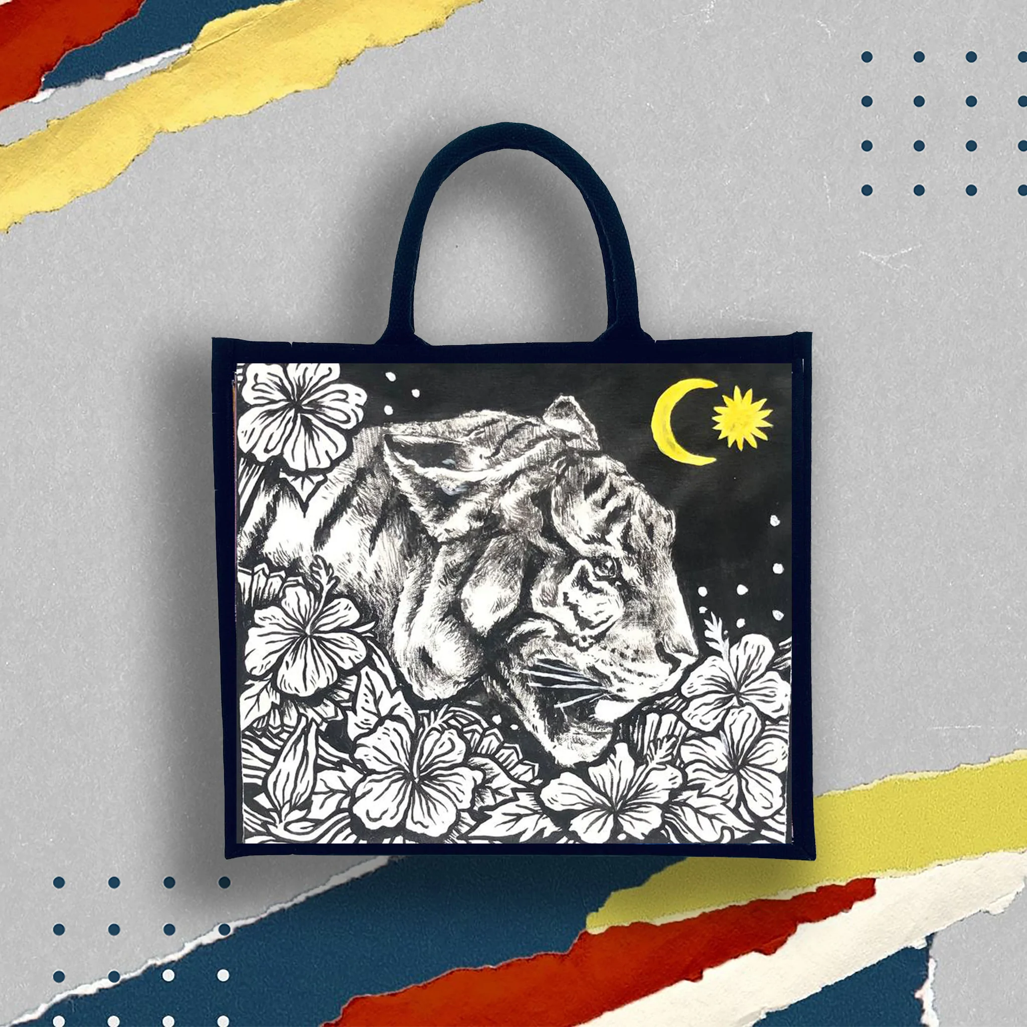 Hasil seni digambarkan di dalam hitam putih menampilkan Harimau Malaya dan Bunga Kebangsaan